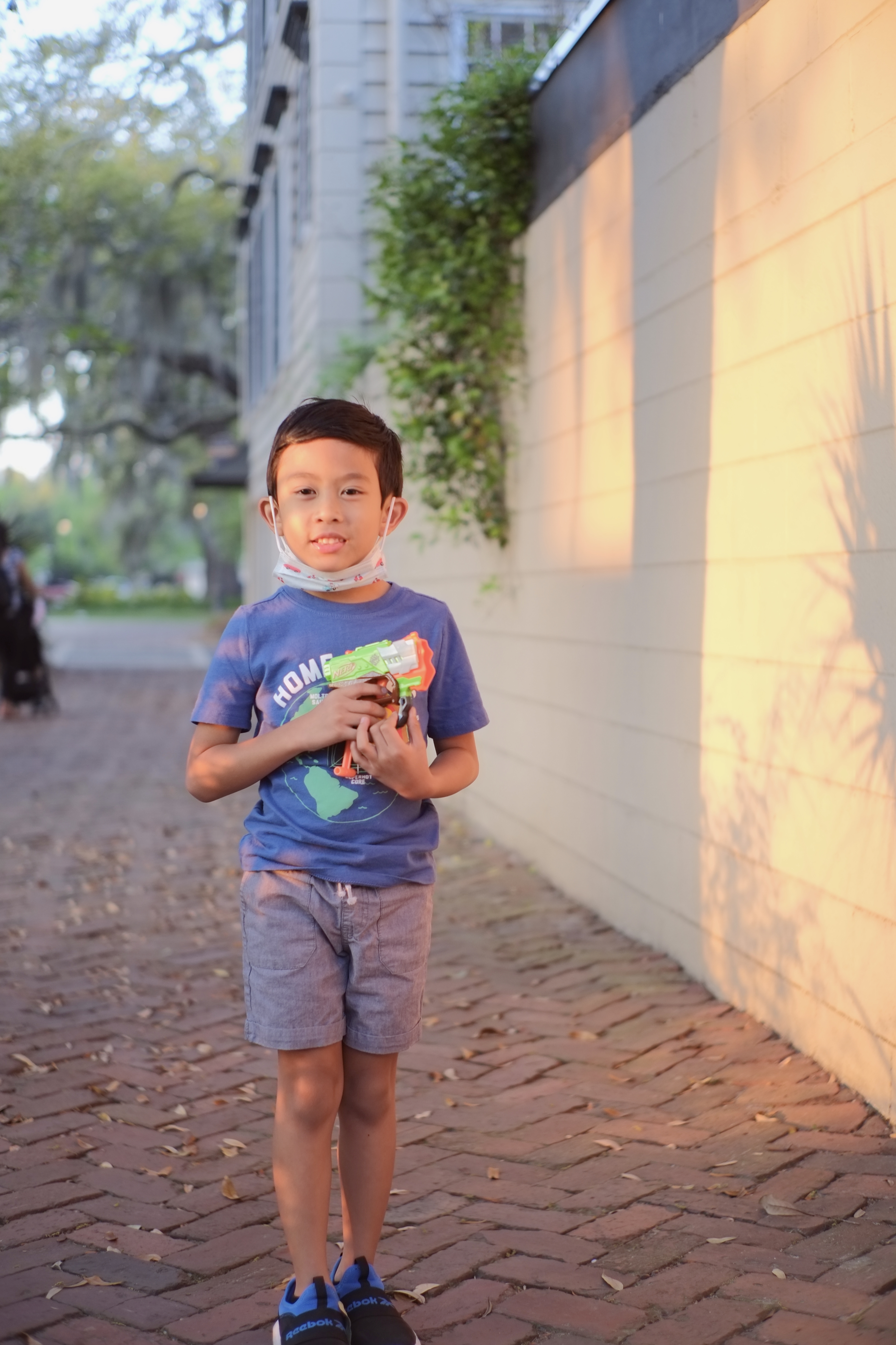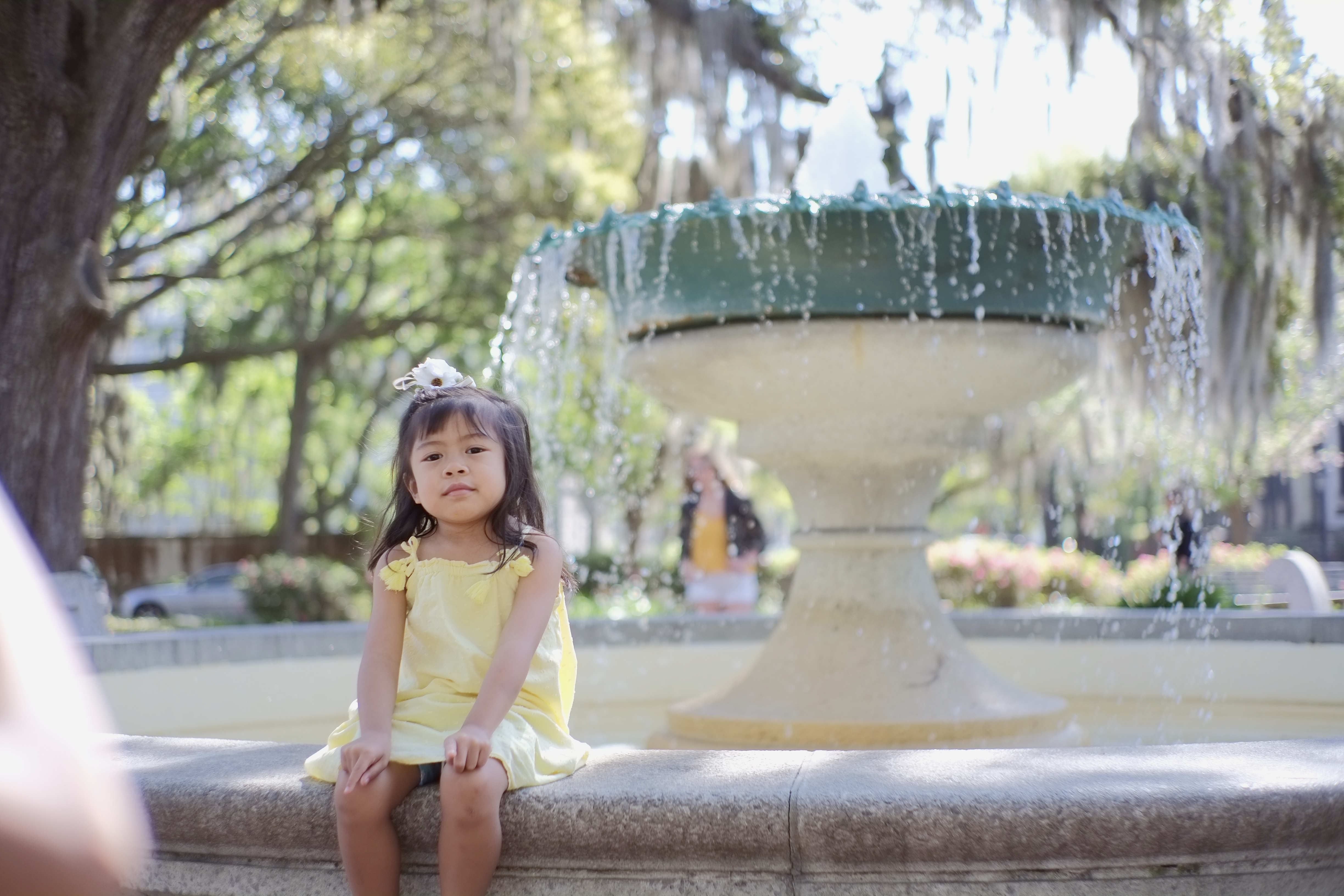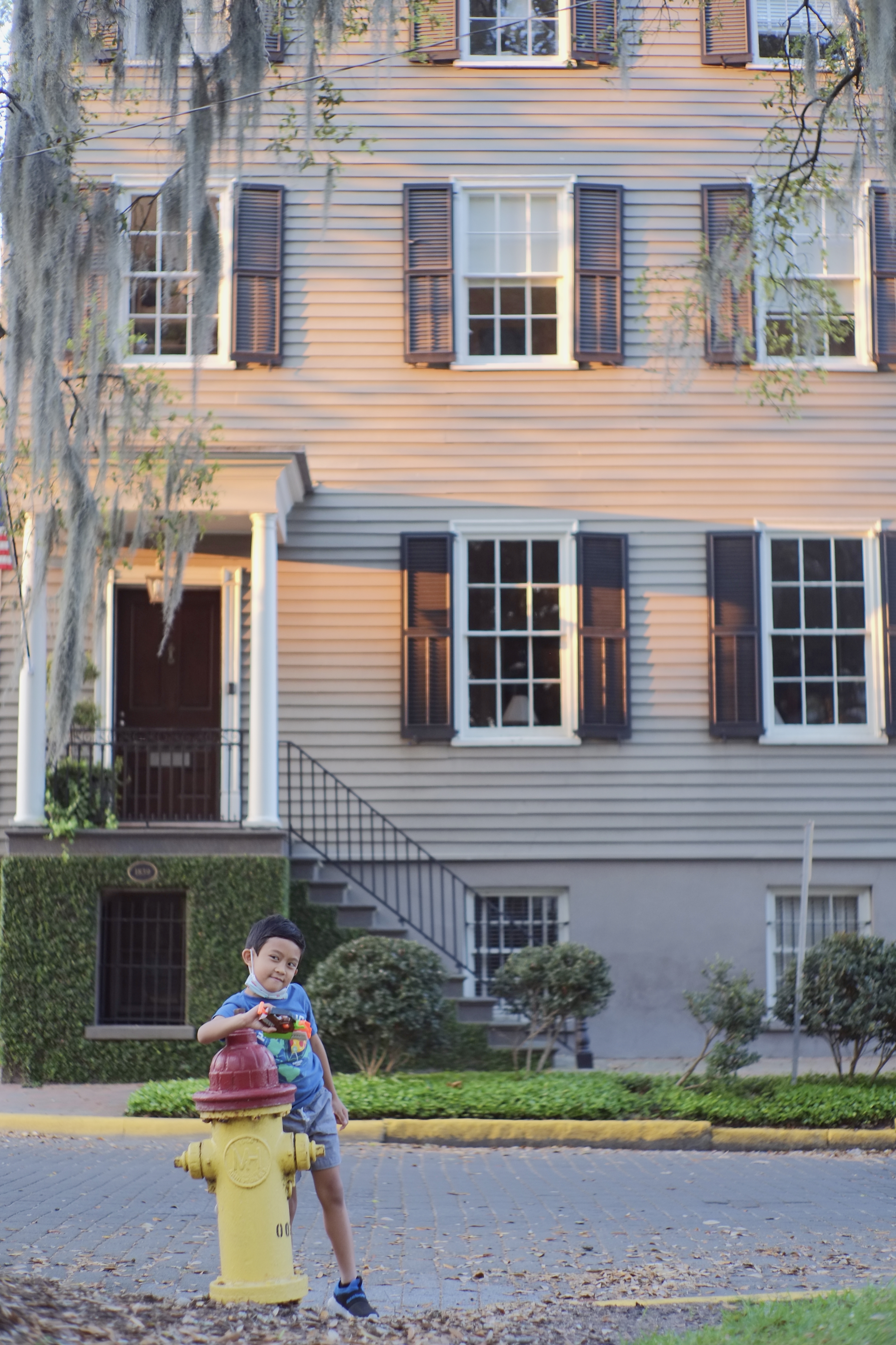 Every street crossing seemed like a grand entrance to a square that you immerse in a breath of awe. You can almost find a small fountain on every square. Perfectly situated an Antebellum home with turquoise and beige color- its boarders wrapped in neat paint of white defining its elegant design. My son stands behind a fire hydrant in front of the home painted in bright red and yellow. I frame a quick shot. A beautiful portrait in an instant becomes a sweet memory.