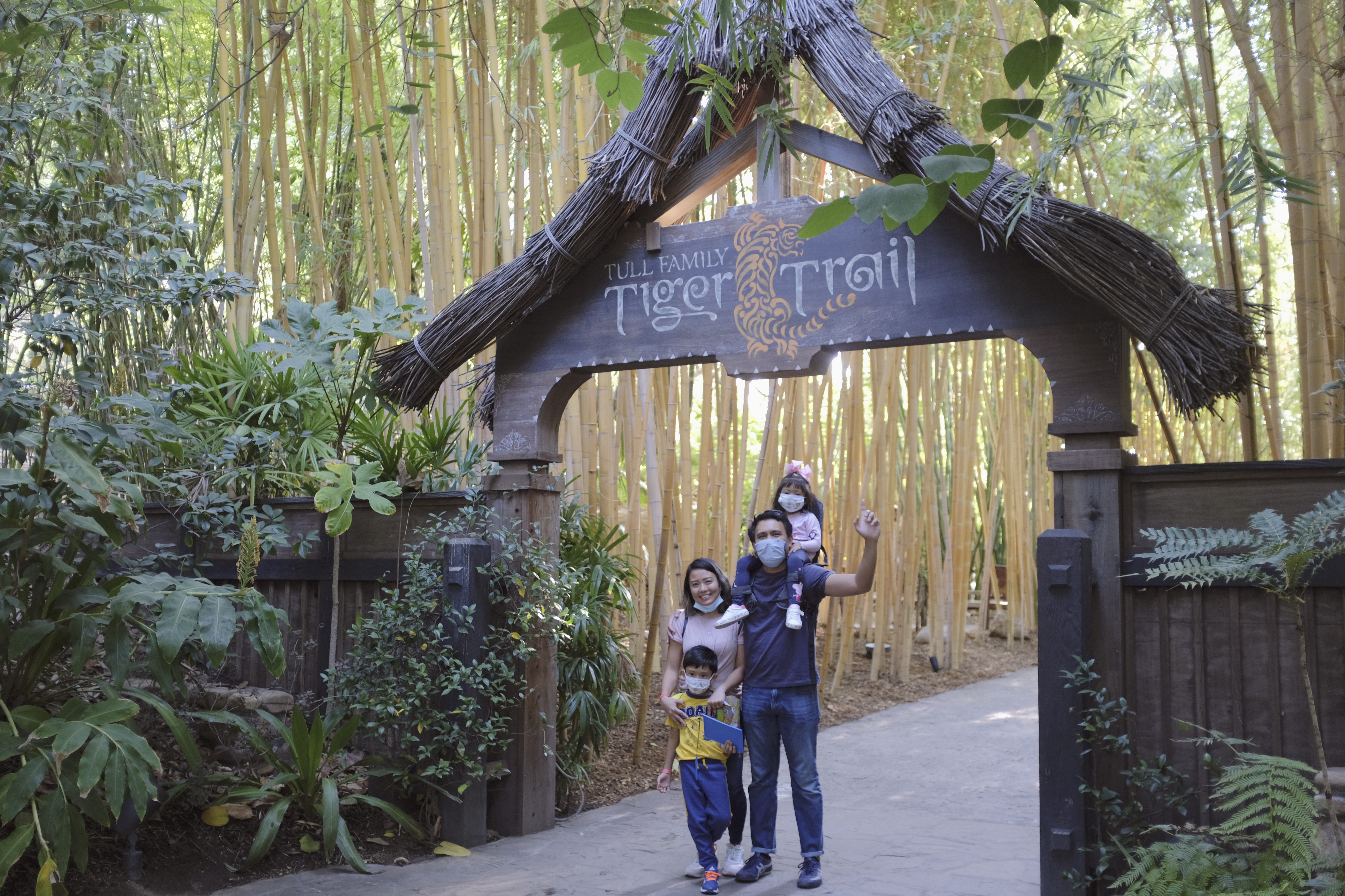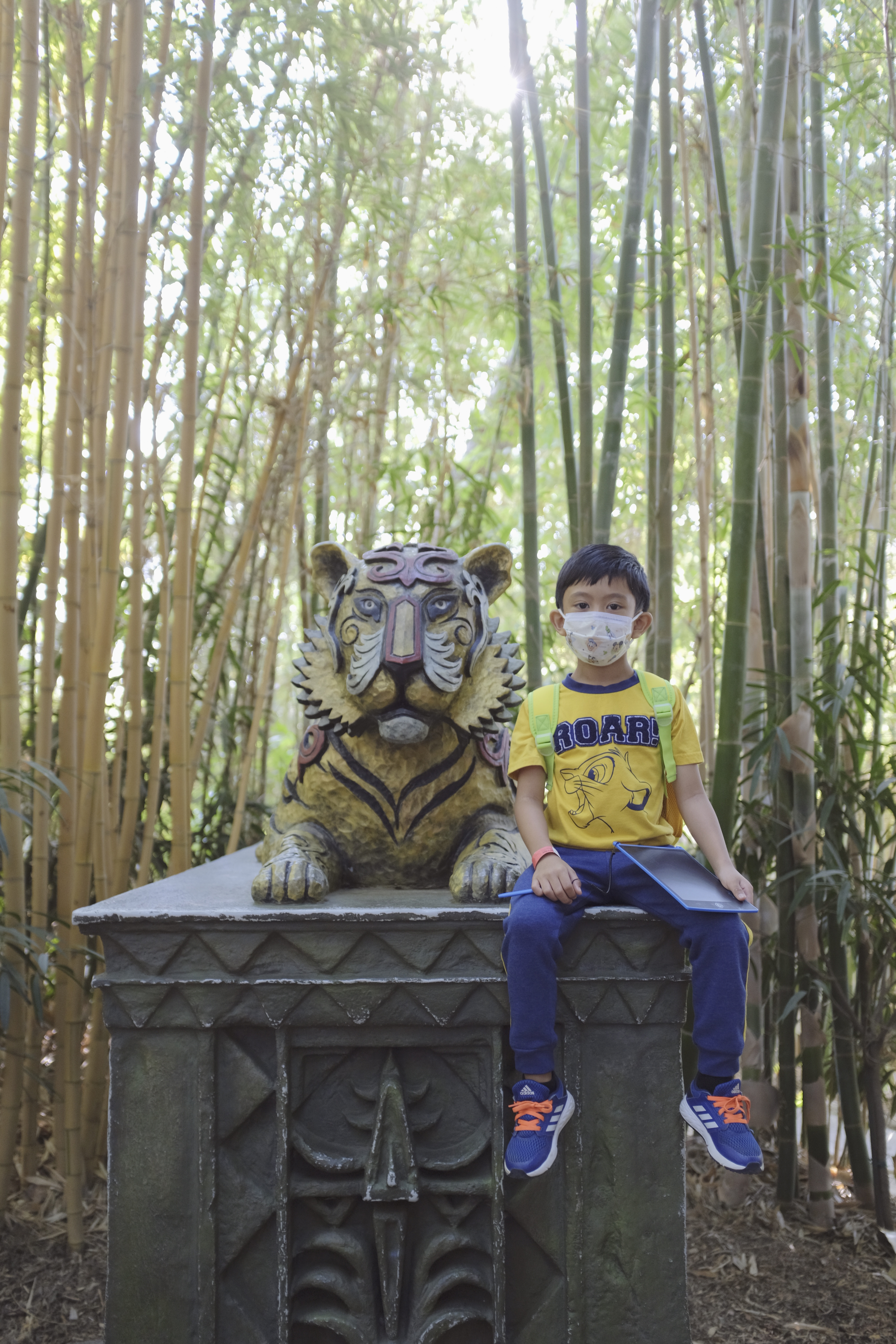 clockwise from the top: a photo of Joel sitting next to a beautiful tiger sculpture | a drawing pad is a wonderful idea to keep their creativity and imagination while exploring the park | our family photo in front of the tiger trail entrance into a scenic bamboo trail.