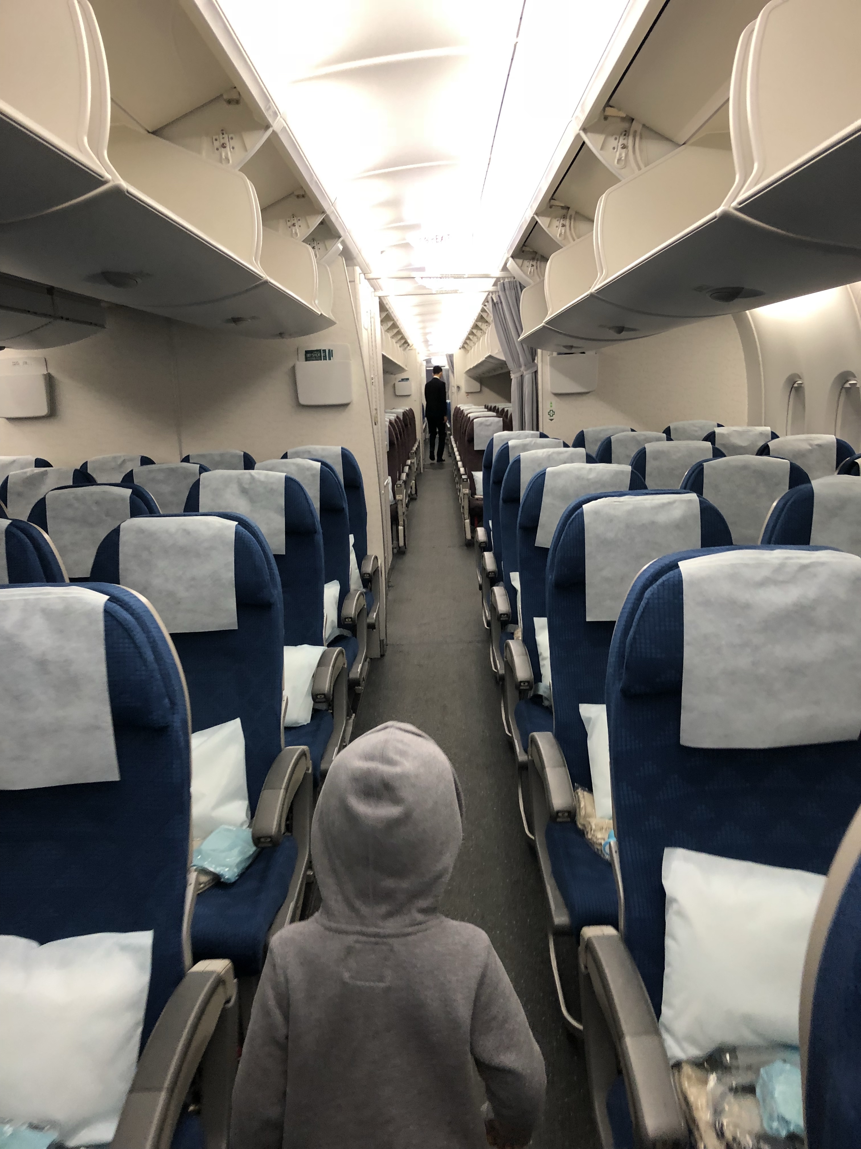 Flying with children has few benifits like getting to board the plane early. You are usually the very first batch of people going into the plane, only you won’t be sitting in the very front business row seats. And that’s ok. The plane is very spacious and has plenty of room during this time. Take advantage of it. As soon as you find your seats (we usually pre book the middle row seats), get oriented and organize your overhead bag and what you need in-flight. I will usually keep the kids small backpack with them stow under the seats or next to them. The backpack(s), for my two kids, has a few small toys to keep them entertained throughout the flight. They each get a choice of a small plush toy, a few smaller toys, a doodle pad, a small book and a sanitizer attached to the backpack zipper. They also bring their own earphones.