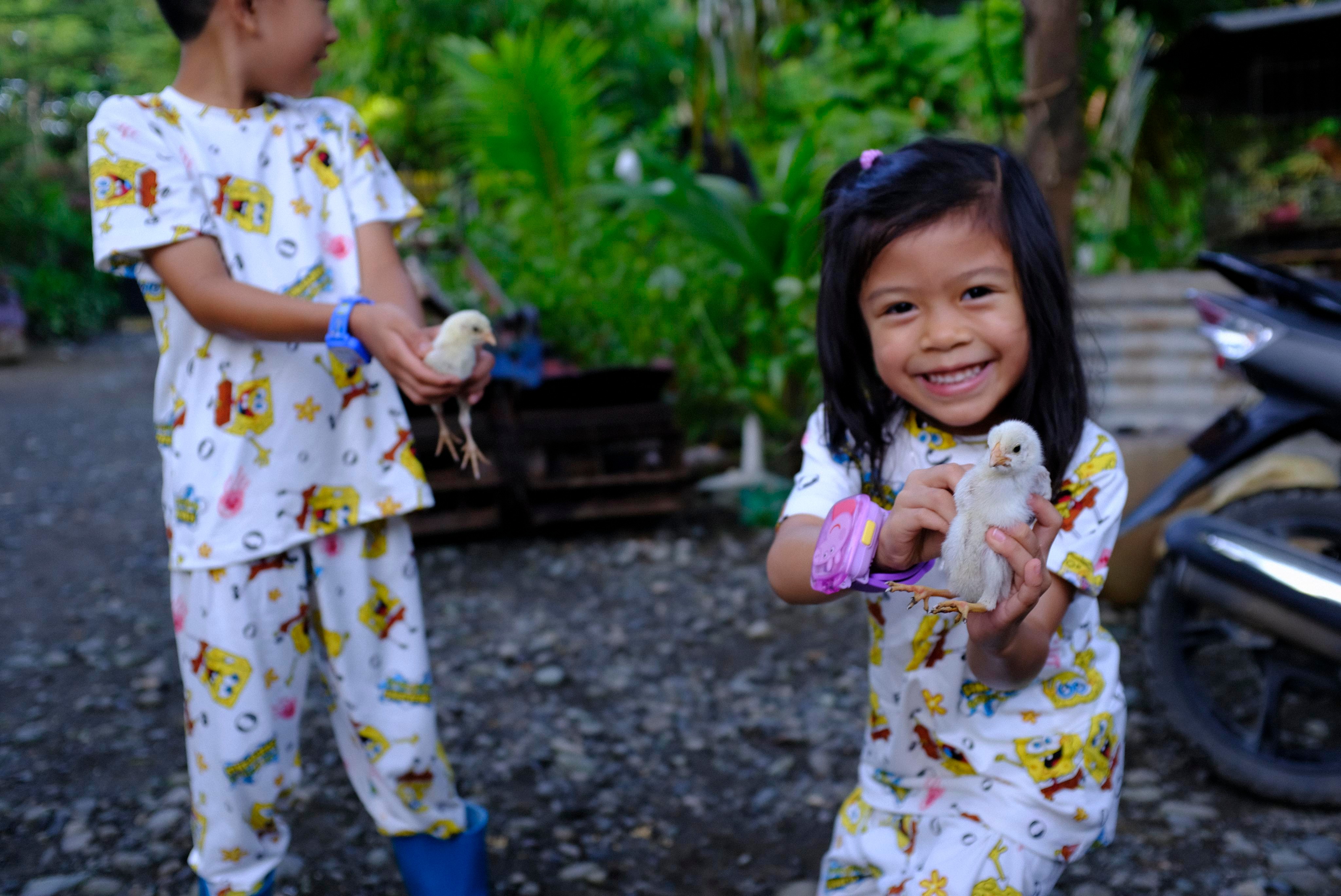 India: “I like to travel in an airplane”… no, I mean where do you want to travel next? “In the Philippines because I like Yona the dog. I had fun there. And I had so much fun with the chicks chasing them around and feeding them.”