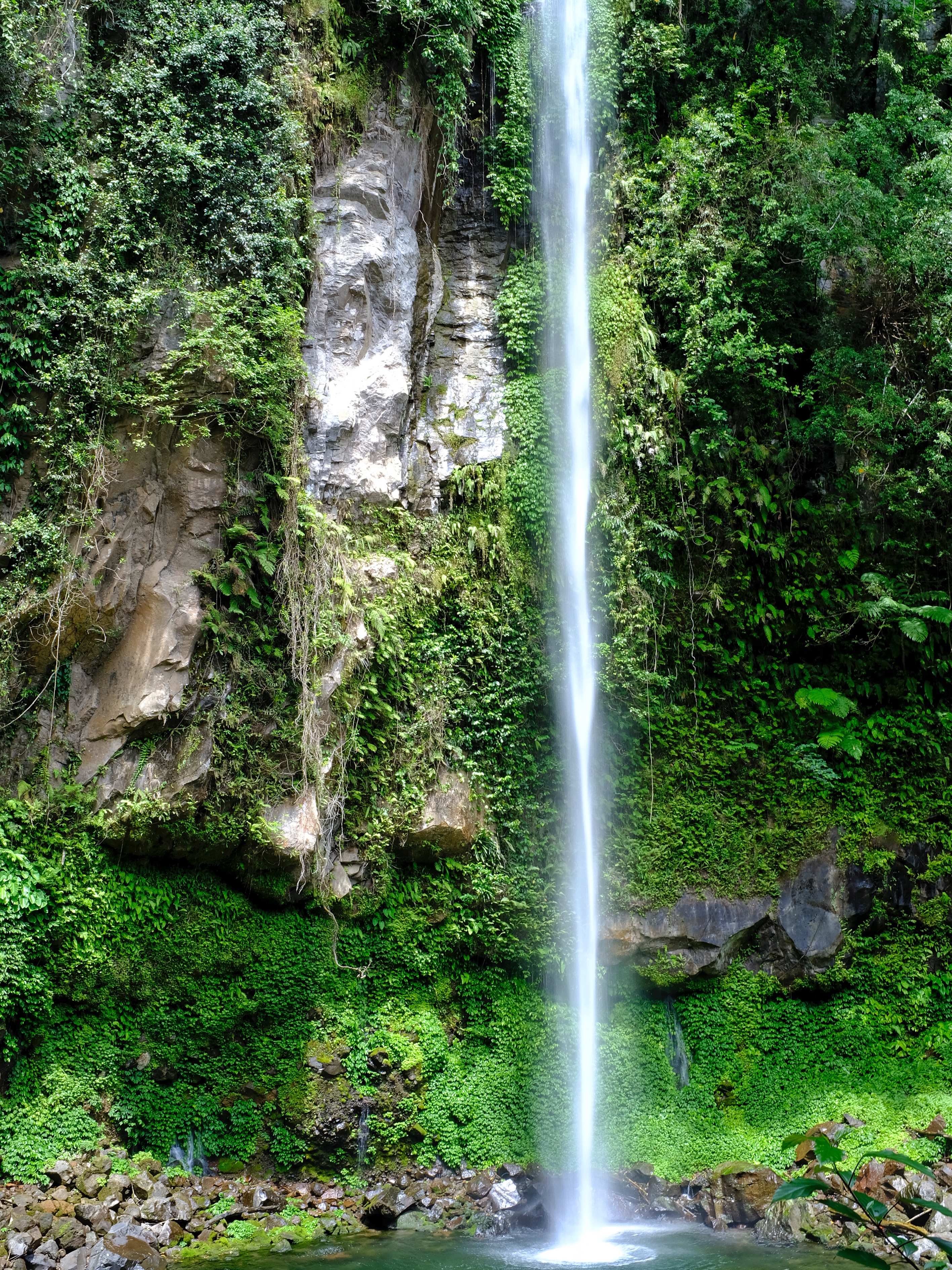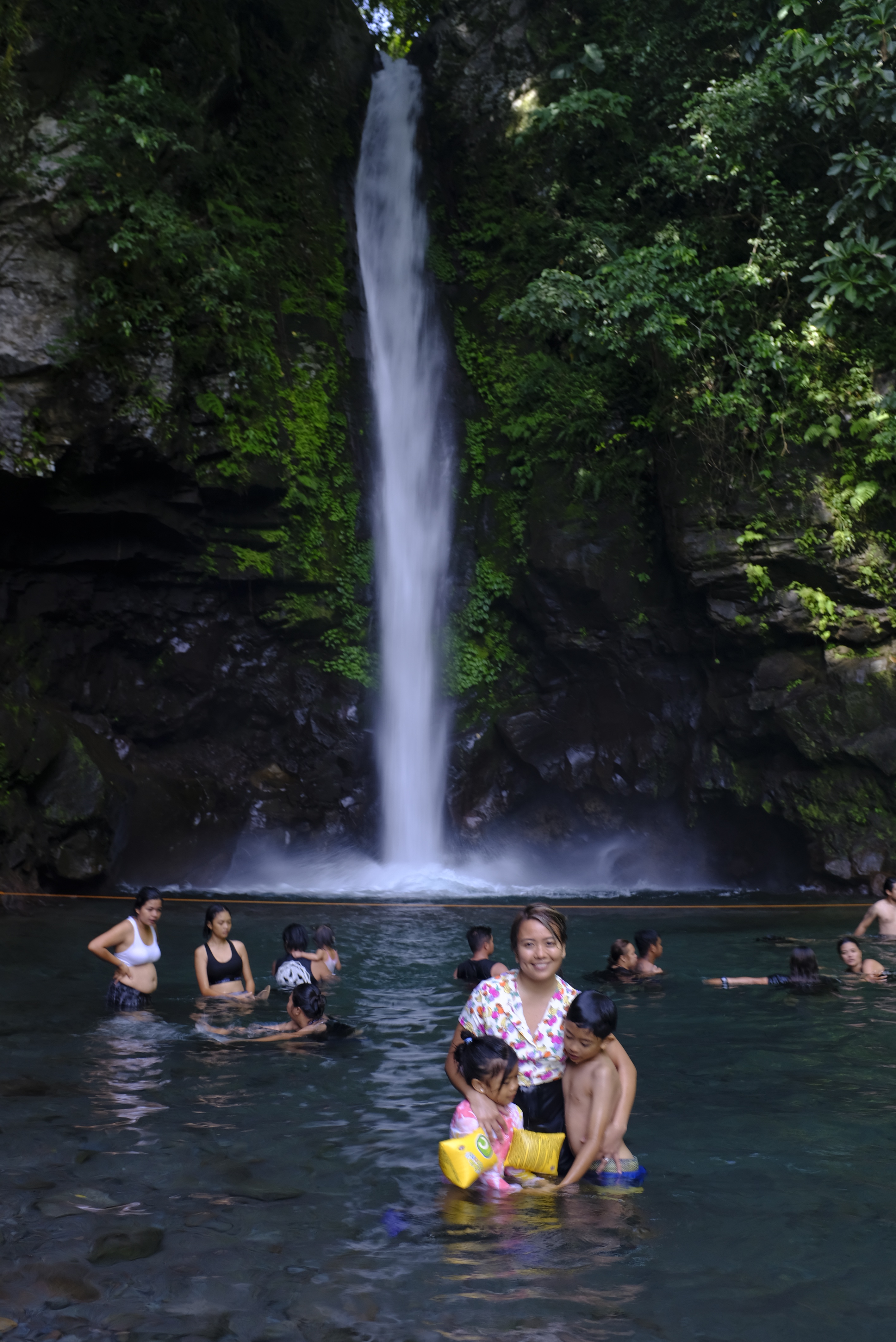 After a restful night we grabbed an early breakfast and headed out our way northwest to Katibawasan falls in Mambajao. It is an easy 23 minute drive from the hotel along the coastal road (Camiguin Circumferential road) about 2/3 of the way, and the rest of the drive up on the mountains. We prepared for swimwear and a light snacks for the kids. We got here at around 09:00 in the morning with just two other people and plenty of space and tables to picnic our baon (packed snacks or food). It has an easy walk from the parking space. From the main entrance you descend down concrete stairs to the waterfalls. It is the tallest waterfalls on the island at 250 feet tall. It has narrow stream that plunges down into a green pool of water below that creates a gentle relaxing mist.