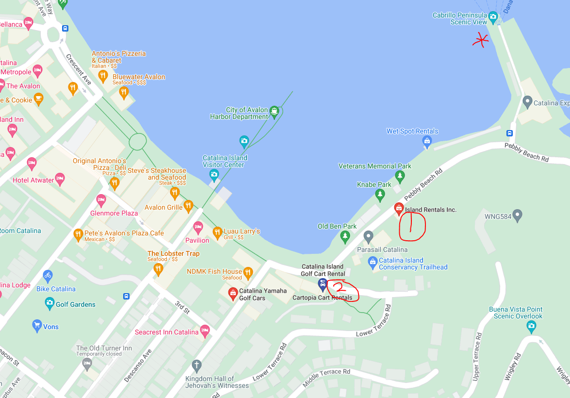 from the ship a tender boat will take you to Avalon port (asterisk) and a walking distance to one of the golf cart rentals (1 and 2) as seen on the map