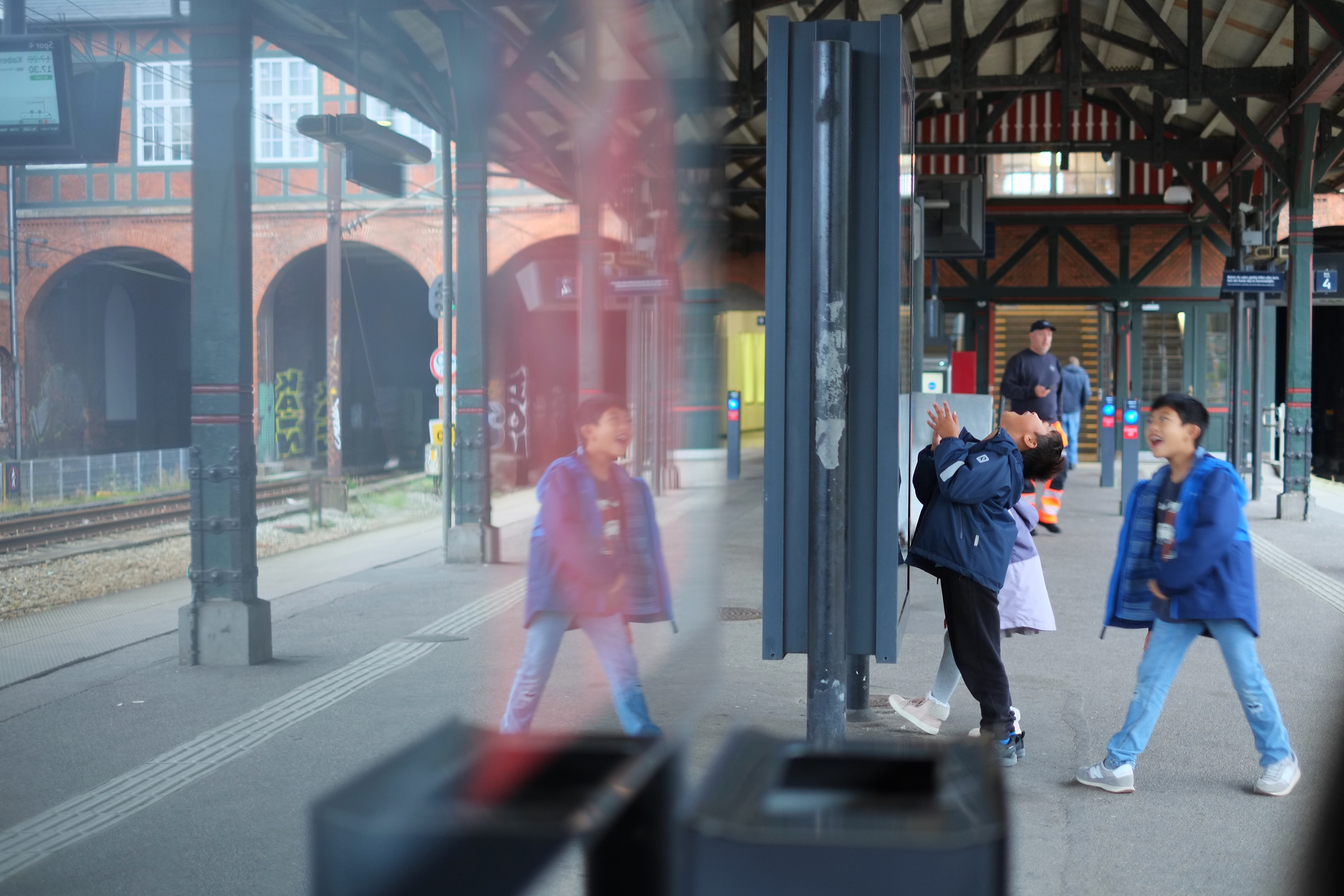 Children will find anything to entertain themselves. Joel and India found this interactive billboard entertaining with a good friend | on a platform to Malmo