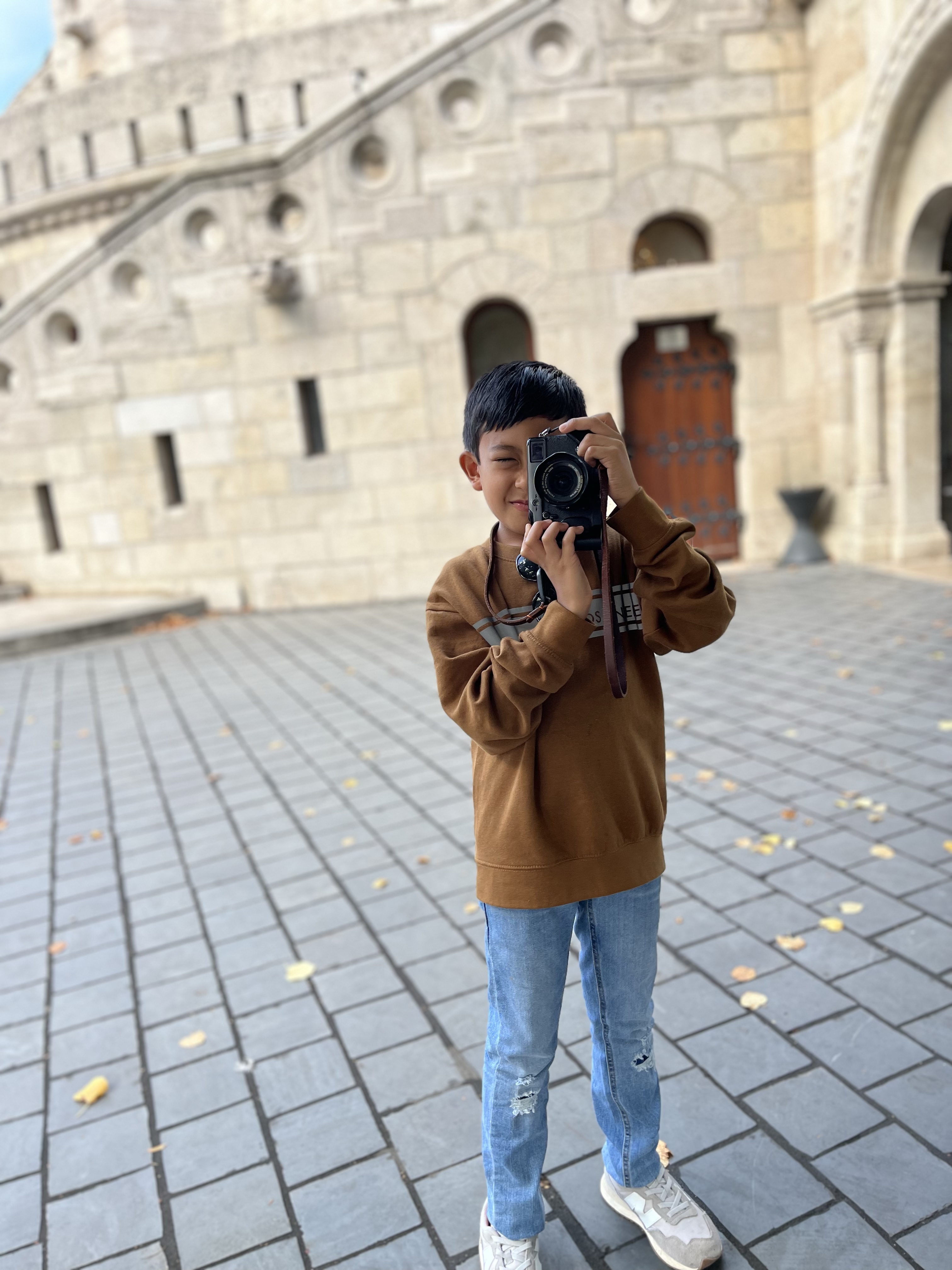 left: Kuya learning his photography skills on a quick break from a sight seeing tour by foot in Budapest right: unpacking their drawing pad and school work on a train to Vienna