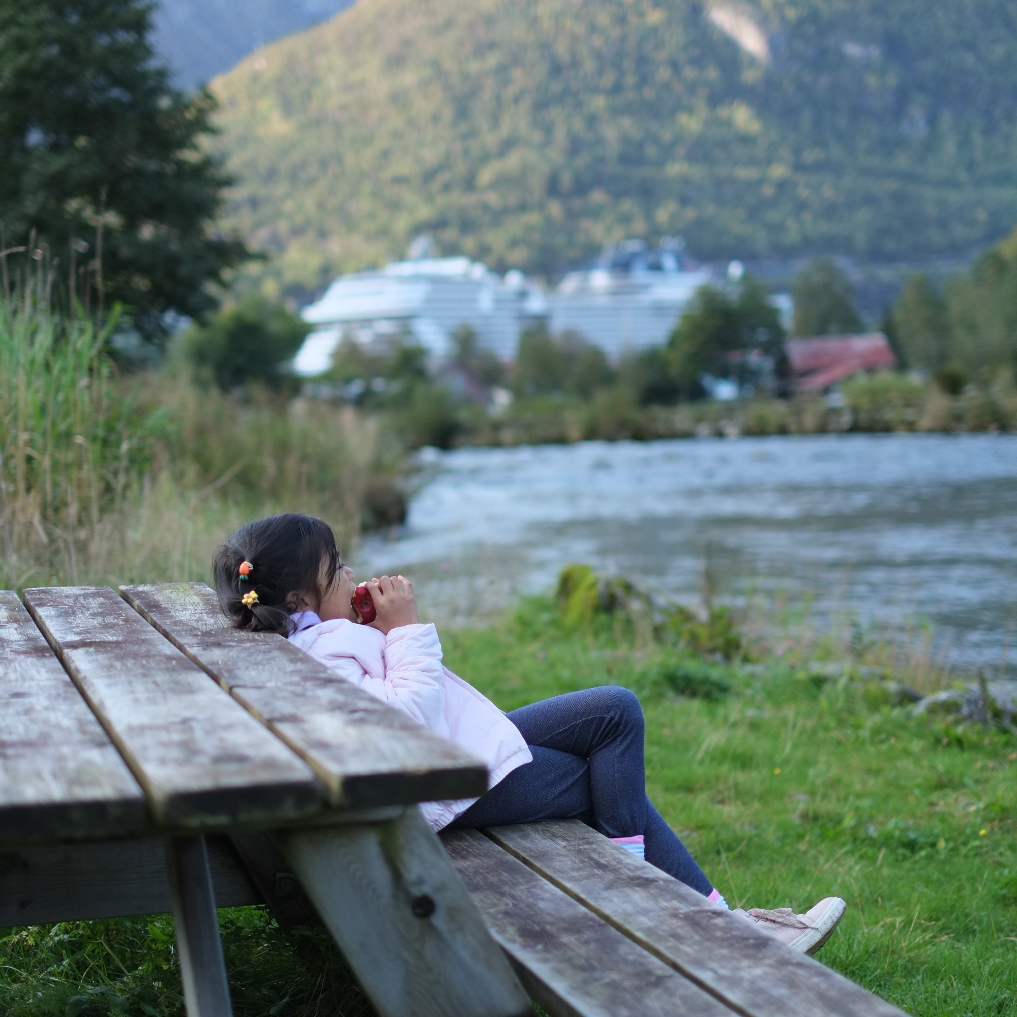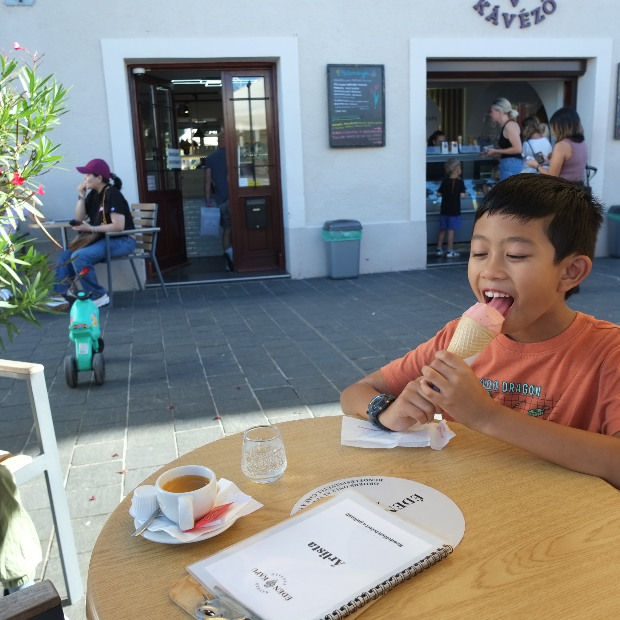 On the left, India is basking on a late afternoon apple treat along a small creek in Norway | On the right, a small ice cream break made this side trip exciting and fun in the quaint and picturesque town of Gyor.